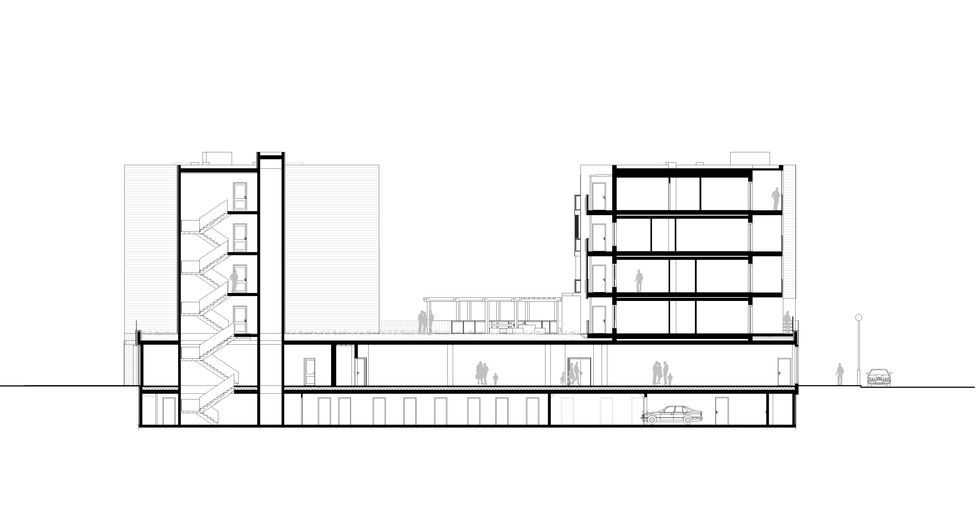 Bloki mieszkalne są ustawione na dwóch liniach. Każda linia jest podzielona na trzy bloki. Każdy blok jest oddzielony woluminem, na którym znajdują się schody. Bloki A, D, E i F mają wejścia do mieszkania z galerii. Obszary mieszkalne mają uprzywilejowane oświetlenie słoneczne z południa / wschodu. W galerii znajdują się małe miejsca do socjalizacji dla każdego mieszkania tuż przed wejściem, mogą liczyć na dobre oświetlenie od zachodu przez większą część dnia. Tutaj można znaleźć ławkę lub stół i spotkać gości i sąsiadów. Galeria ma system pionowych drewnianych listew w celu ochrony prywatności mieszkańców.